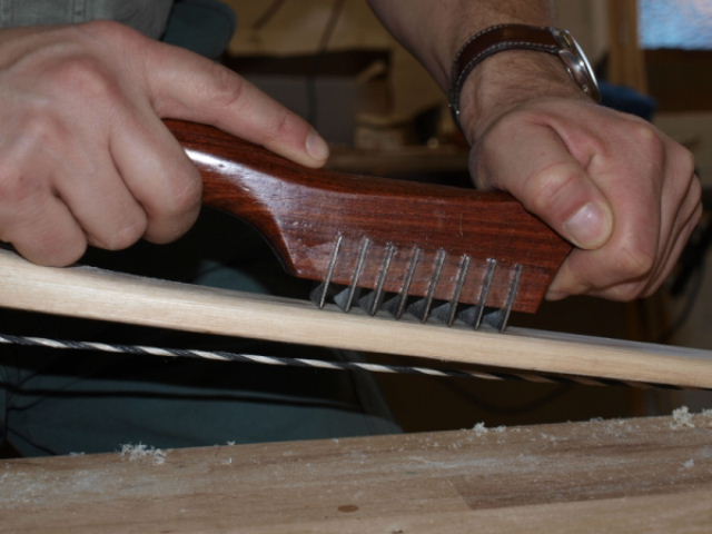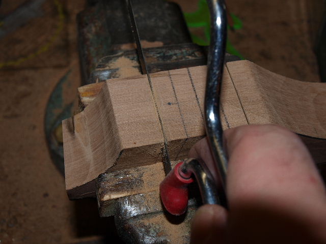 Da der Flot in der groben Form noch eckig und gut spannbar ist, werden zu diesem Zeitpunkt die Linien für die späteren Sägeschlitze für die Klingen aufgezeichnet und gesägt. Die Klingen stehen später in einem Winkel von 10° zur Senkrechten.