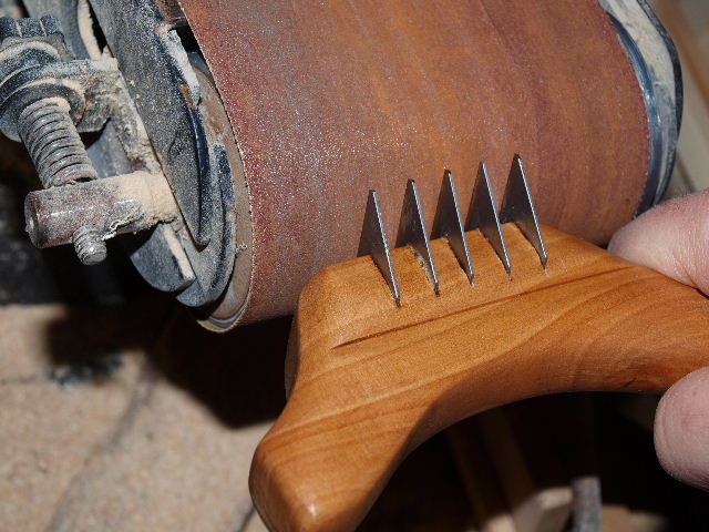 Nach dem Aushärten werden die seitlichen Spitzen der Stanley-Klingen abgerundet. Sie bergen ein hohes Verletzungsrisiko, daher weg damit. Wer eine konkave Schneidfläche benötigt, kann diese problemlos an der Walze des Bandschleifers, aber auch an anderen Schleifscheiben herstellen. Vorsicht, bitte Schutzbrille und Handschuhe tragen!