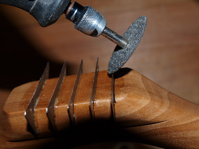 Danach müssen die Klingen allerdings geschliffen werden. Dies geht z.B. mit der kleinen Flexscheibe an einem Dremel oder auch mit einem feinen Schleifstift an der Bohrmaschine. Den Flot dazu fest in einen Schraubstock spannen.
