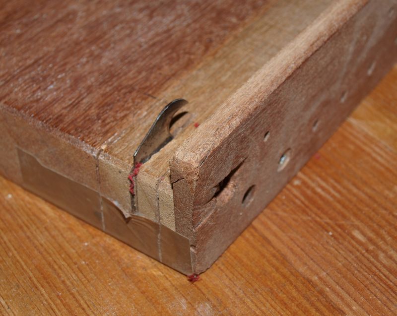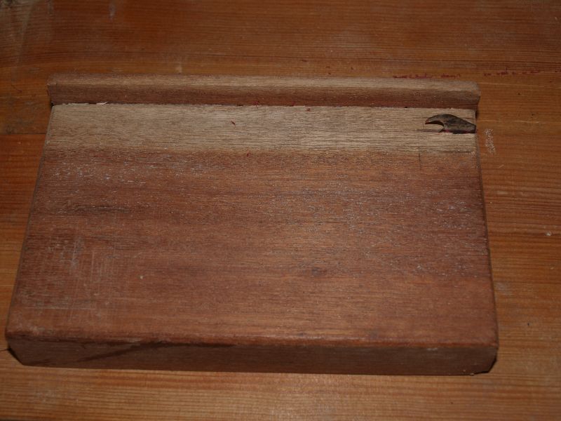 An ein Holzbrett wird eine gleichlange, oben überstehende Leiste geleimt . In einen seitlichen Schlitz wird eine Teppichmesserklinge (diese mondförmigen) geschraubt. Verschiedenen Schlitze in unterschiedlichem Abstand zur Anschlagleiste dienen zum Herstellen unterschiedlich breiter Lederstreifen. Selbst sehr weiches Bezugsleder läßt sich so gut schneiden. Für meinen Sap-Skeleton habe ich bordeauxrotes Leder gewählt. Ich sehe auf der Nahaufnahme: Meine Schneidlade ist ganz schön in die Jahre gekommen. Egal, funktioniert immer noch mit der ersten Klinge.