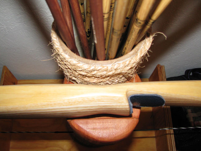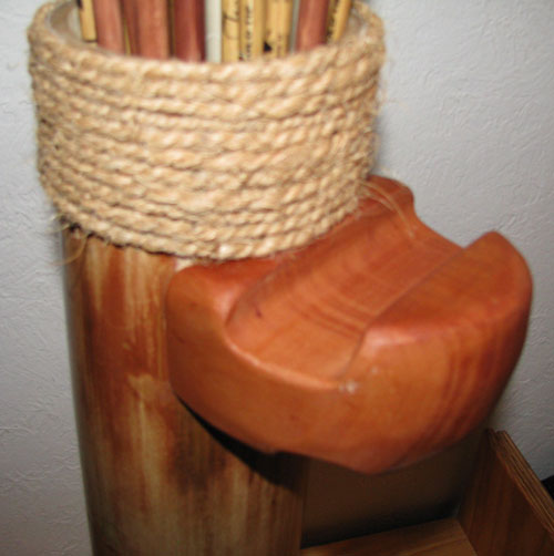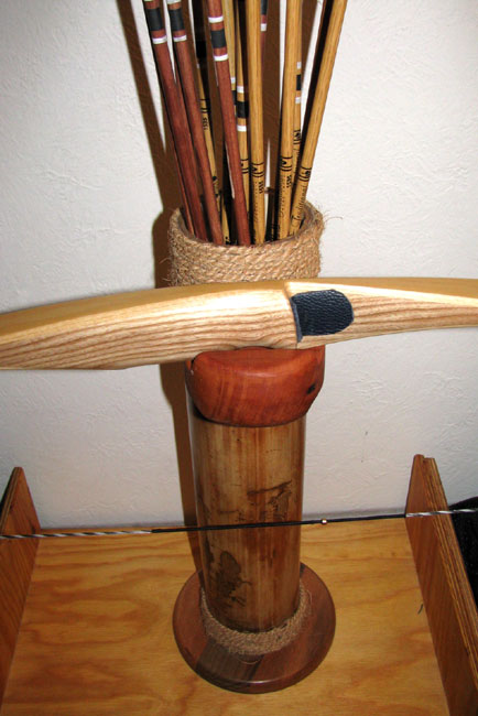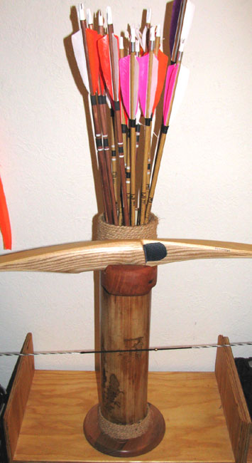 Für’s Hallentraining habe ich mir einen Pfeilständer mit Bogenauflage gebastelt. Die Bogenauflage hat oben eine Einbuchtung wo der Bogen darauf liegt – und unten eine Einbuchtung wo man bequem mit der Hand greifen kann, um den Pfeilständer herumzutragen.