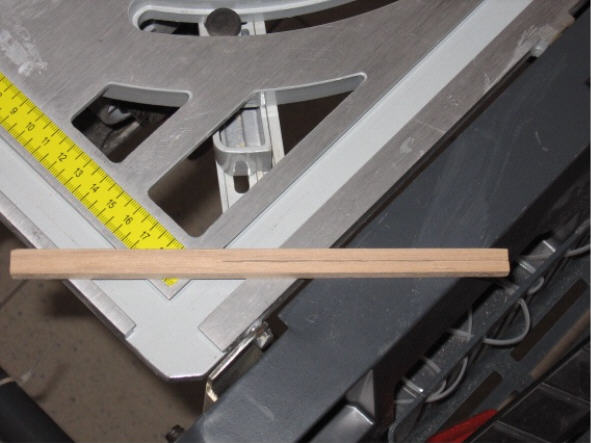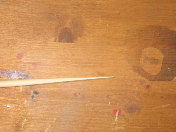 Am Anfang stand eine 1x1 cm und 2m lange Leiste aus dem Baumarkt, welche ich schon sehr genau, in Bezug auf gerade Maserung, ausgesucht und in der Mitte durchgeschnitten habe. Danach wurden die Quadratleisten mit des selbsgebauten Schaftfräse (ein Zwischending aus der von Klaus1962 und der im Buch gezeigten) auf 8,2mm gefräst. Die so entstandenen Rundlinge wurden danach mit der Schleiflade, 100er Schleifpapier und der Bohrmaschine auf 8mm Dicke geschliffen. Der fertige Schaft.