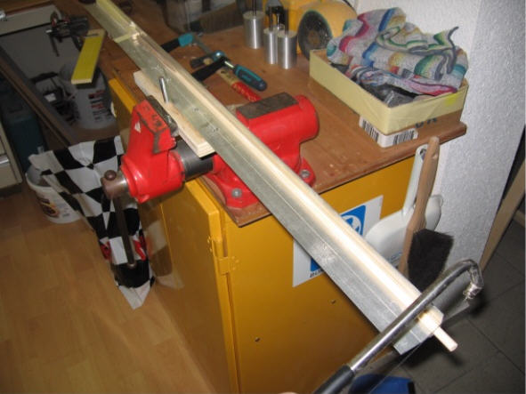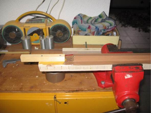 Die Vorrichtung zum geraden Verleimen. Der fixierte und aufgekeilte Vorschaft. Der "Hochzeit" von Vorschaft und Schaft. (Von nun an müssen die immer zusammenbleiben - grins