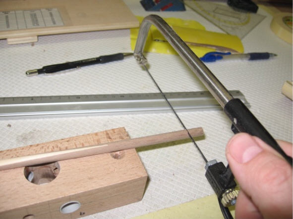 Die 1x 1cm Vorschäfte aus Nussbaumholz habe ich mit Hilfer einer selbst hergestellten Schneidelade, welche ich auf eine Stichsäge aufgeschraubt habe, in der Mitte aufgesägt. (Achtung das feinste Sägeblatt verwenden - meines war 1mm dick)