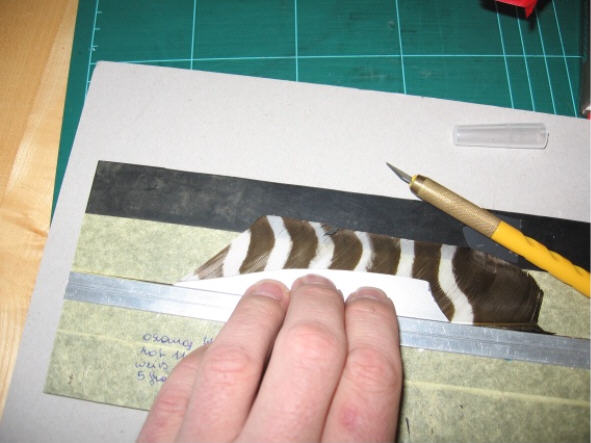 Federn spleißen und Federn schneiden. Die weißen Seitenflächen der Federkiele nun farbig angleichen. Mit der selbstgebauten Crestingmaschine das Cresting vorzeichnen und mit Edding-Stiften ausmalen. Das fertige Cresting.