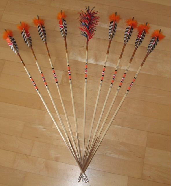 Die Federn sind 4" lang und haben Shield Form. Die Tracer sind aus weißem Kaninchenfell welches ich mit Haarfarbe vom Friseur gefärbt habe. Ein Schaft wurde zu einen FLUFLU (doppelte Klobürste - gezeigt im Buch von Volker Hübschmann)