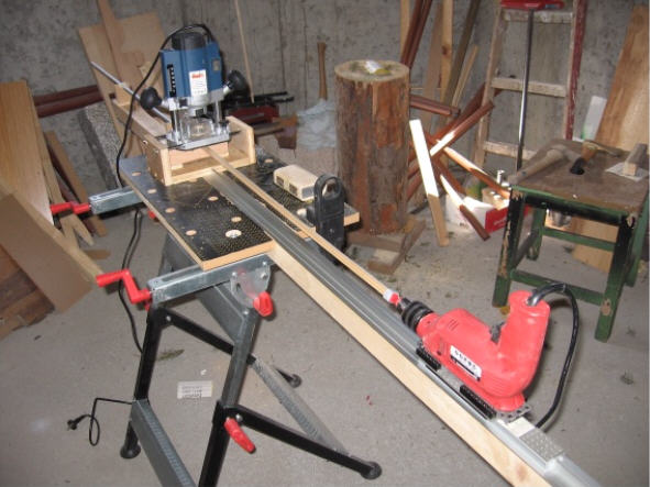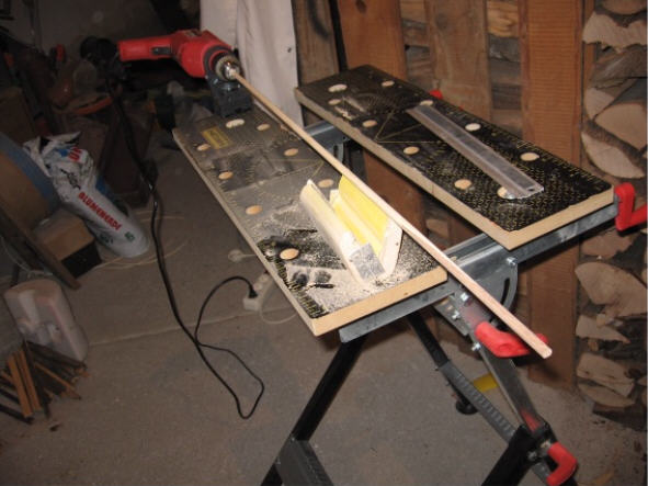 Danach wurden die Quadratleisten mit des selbsgebauten Schaftfräse (ein Zwischending aus der von Klaus1962 und der im Buch gezeigten) auf 8,2mm gefräst.