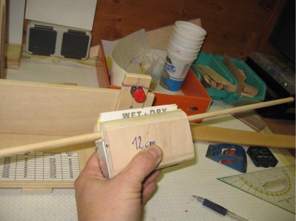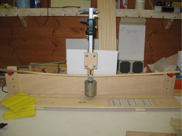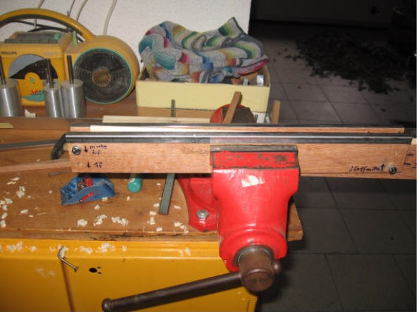 Danach spine ich die Schäfte auf die gewünschte Stärke durch abschleifen von Hand mit der Schleiflade (Es funktioniert gut, die Schäfte sind halt nicht alle genau 8mm dick sondern einige im Mittelteil nur halt 7,95 oder 7,92mm - ich denke das dürfte kein Problem darstellen) Den Bau des Sinetesters findet man ebenfalls im Buch von Volker Hübschmann.
