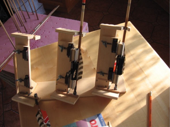 Mit meinem selbstgebauten Befiederungsgerät die Federn aufkleben