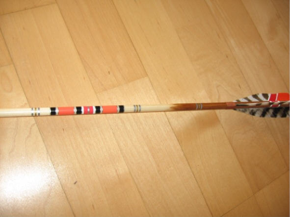 Die Federn sind 4" lang und haben Shield Form. Die Tracer sind aus weißem Kaninchenfell welches ich mit Haarfarbe vom Friseur gefärbt habe. Ein Schaft wurde zu einen FLUFLU (doppelte Klobürste - gezeigt im Buch von Volker Hübschmann)