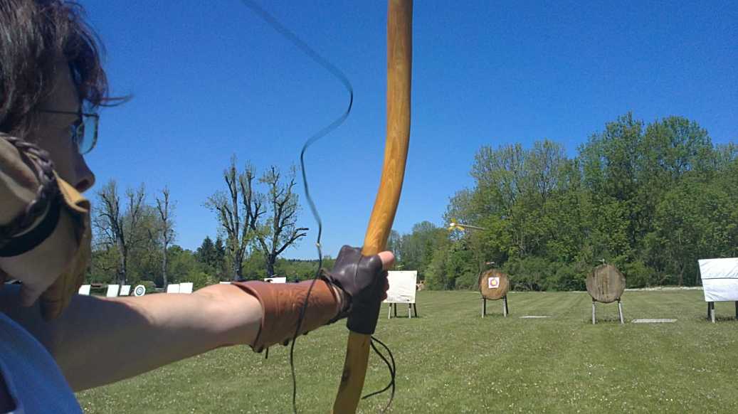 Oben zeigt die Sehne noch zum Gesicht/Ankerpunkt. Weiter unten entfernt sich der Sehnenschatten dann vom Gesicht und beschleunigt den Pfeil nach vorne.