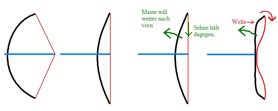 3. Durch diese sich in Richtung GRIFF bewegende Welle weren die ENDEN nun als GEGENBEWEGUNG wieder zueinander geschlagen. (Ich skizziere das gleich noch!). Je nachdem, wie schnell da passiert, ist ggf, also auch hier, die Sehne noch in der Pfeilnocke. Genau DER Moment wurde hier eingefangen!