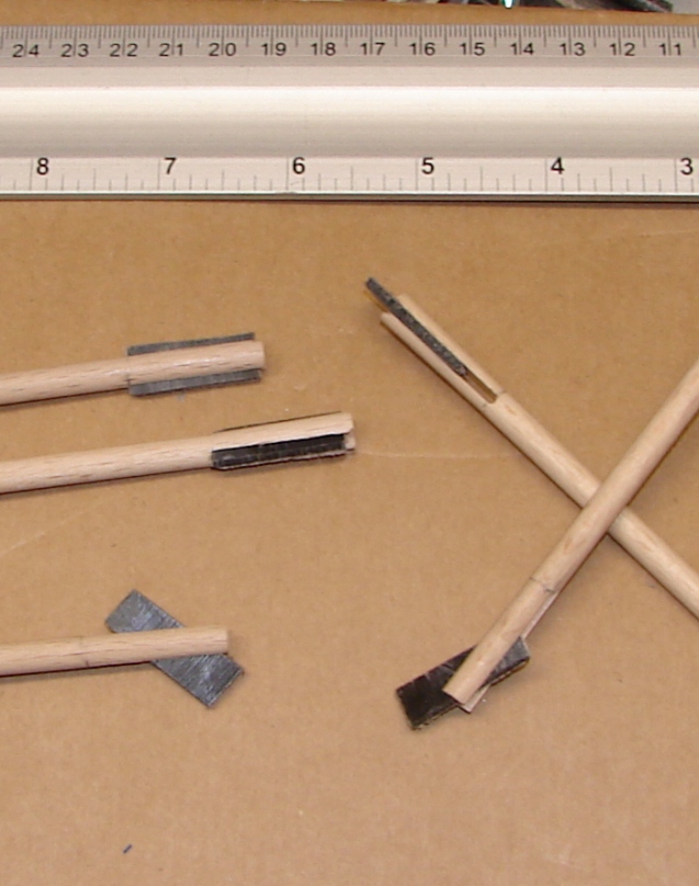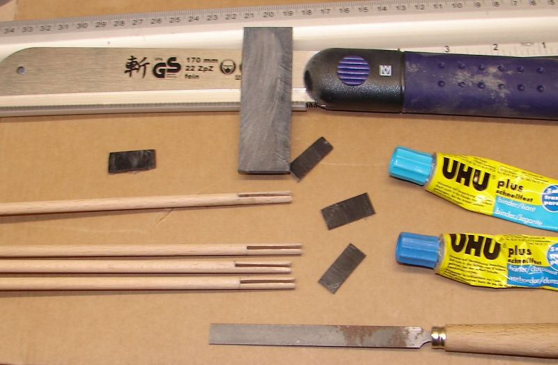 Falls es von Intresse ist, ich habe mal beim Bau von Kinderpfeilen ein paar Fotos gemacht. Die Pfeile wurden aus 6mm Buchenholz mit 2mm starken Horninlays gemacht, dabei sind die Inlays hier nur 1" lang, aber ich mache nach diesen Prinzip alle meine Hornverstärkungen!