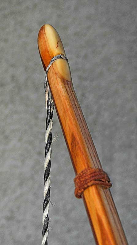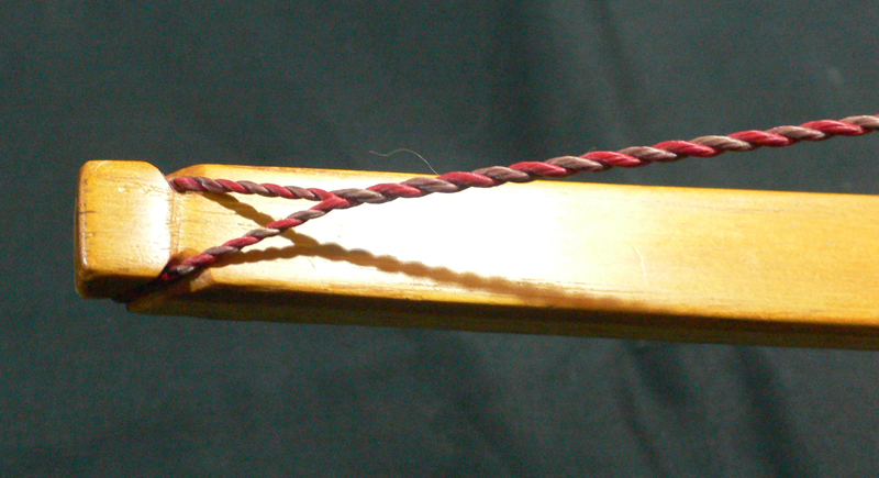 Die Sehne ist fest am Bogen, auch entspannt, und wird zum Spannen über beide End-Kerben eingehängt!