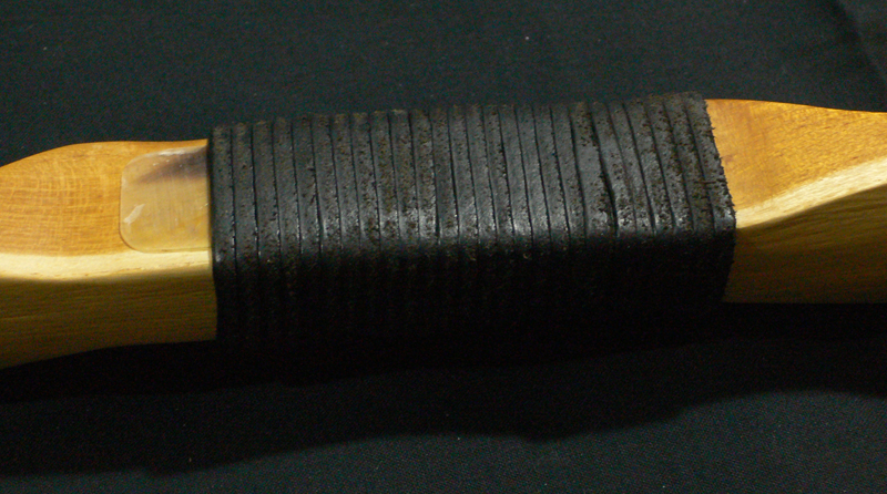 Mein erster und bisher einiger Selbstgebauter ist ein simpler Eschenbogen mit Ledergriff, 1,95m lang mit 45#@29". Das Ding ist eine undefinierbare Zwischenform aus Lang- und Flachbogen (eher Letzteres), den ich vor 2 oder 3 Jahren in 'nem Kurs gebaut habe. Hat zwar 'n paar Stauchrisse am Bauch, schießt aber recht flott.