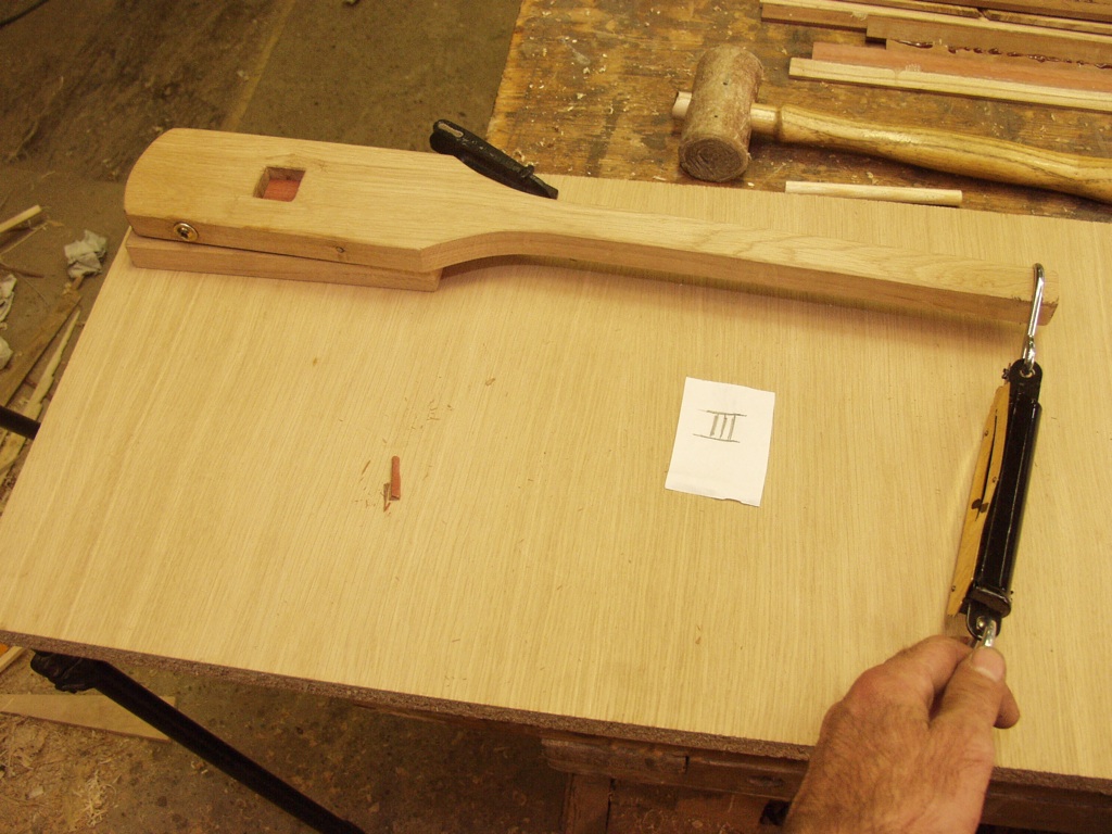 und weil ich das Thema wirklich wichtig finde - schließlich bestimmt eine gelungene Verleimung maßgeblich über Erfolg oder Mißerfolg eines Bogenbauprojektes - hab ich mir das Vergnügen gegönnt, die von Tim Baker (Bibel Band 1 S. 222 ff) vorgeschlagene Methode zum Testen von Verleimungen auf Massaranduba anzuwenden.