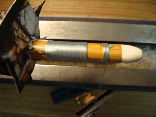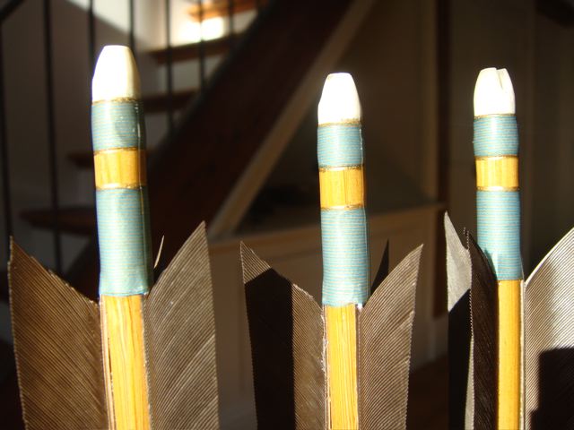 Zum Wickeln ne Anmerkung und ne Frage: Ich wickle meine Bambuspfeile (normale Bogenpfeile, nicht Kyudo) auch, allerdings mache ich die Nockwicklung vor dem Aufkleben der Federn, da bin ich freier in der Handhabung. Die Wicklung vorne dann nach dem Aufkleben. Allerdings sind meine Wicklungen nicht so perfekt wie deine. Ist die vordere Wicklung mit 3 Fäden paralell ausgeführt (2x blau und 1x gelb)?