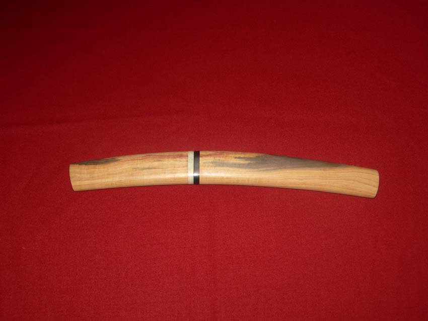 Scheide und Griff sind aus einem Stück Flieder, die Abschlüsse sind aus Horn und Knochen vom Wasserbüffel. Die Klinge ist aus einem Stück 1.4034 heraus geschliffen (nicht ganz stielgerecht, dafür rostfrei). Härte ca. 56 RC und scharf wie die S..!