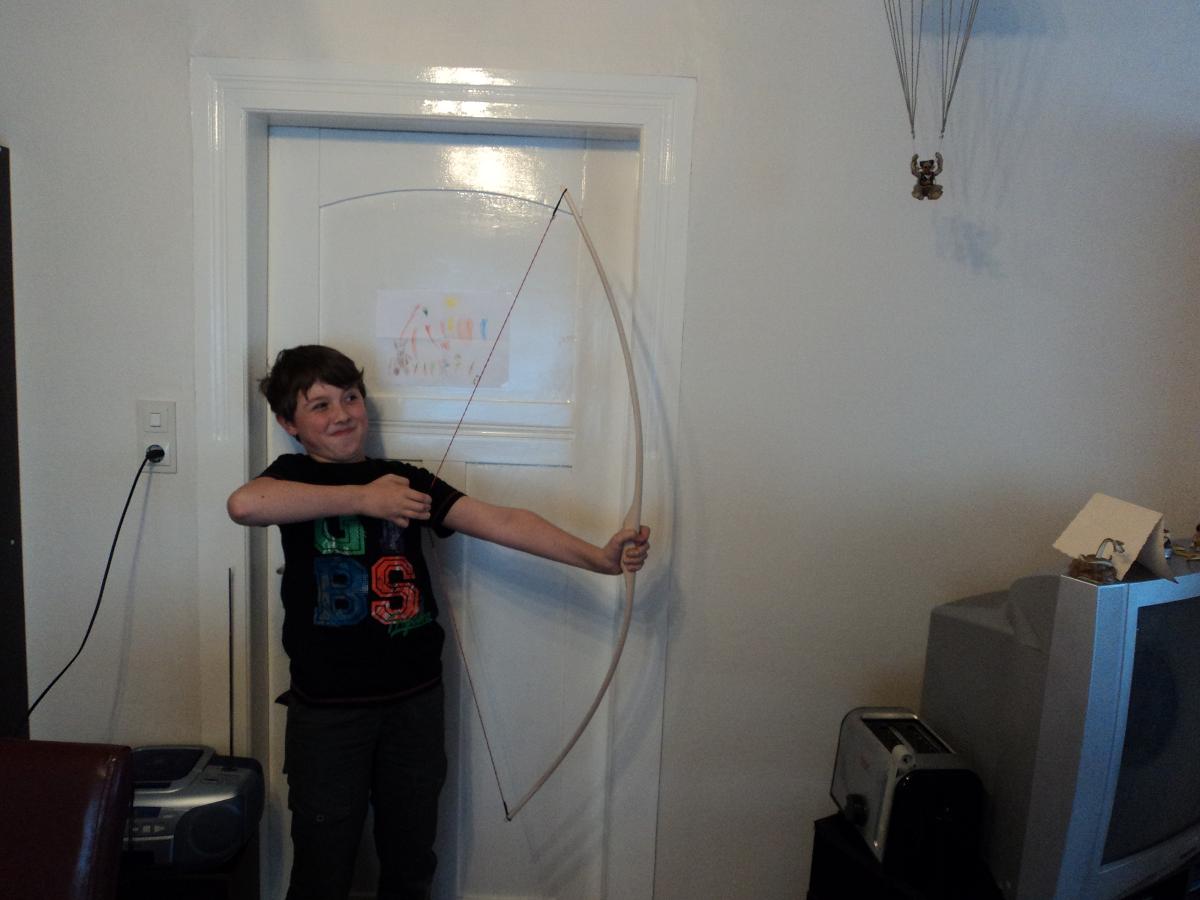 Der erste Bogen ist ein Flachbogen mit 1m Länge, 6cm Stockhöhe und mit 10-12 lbs sowie ca 18" Auszug für meine kleine 5 jährige Tochter.