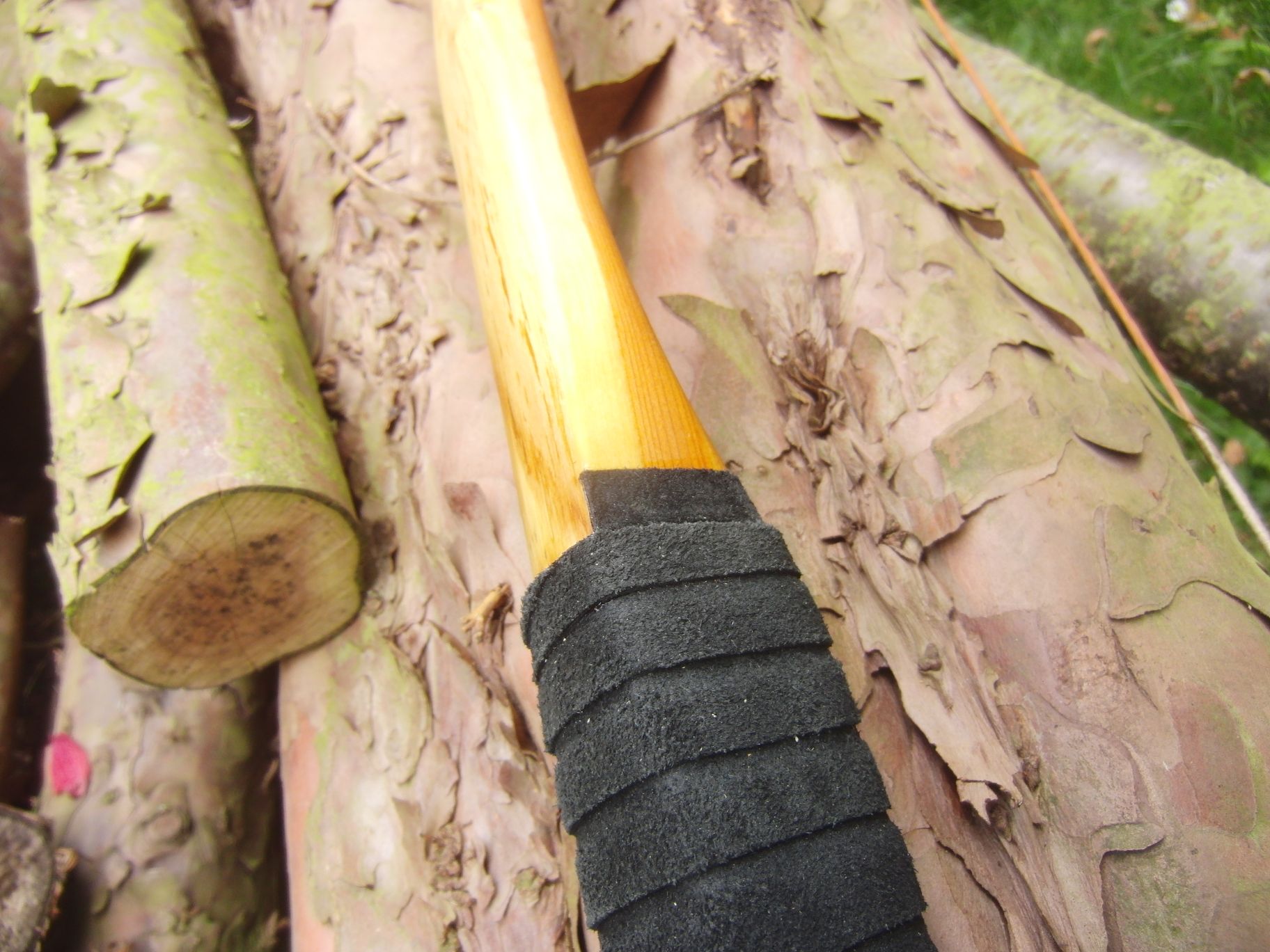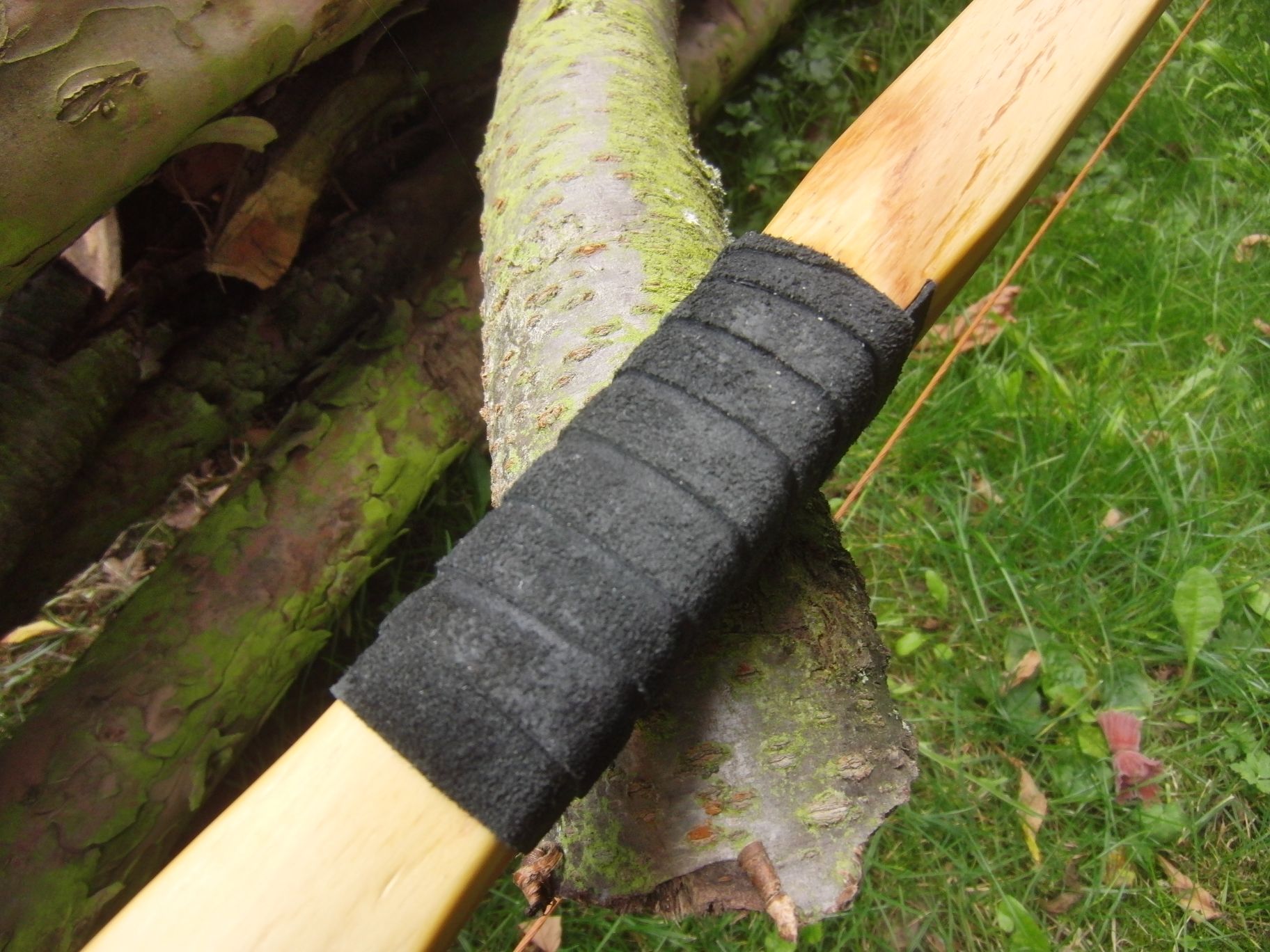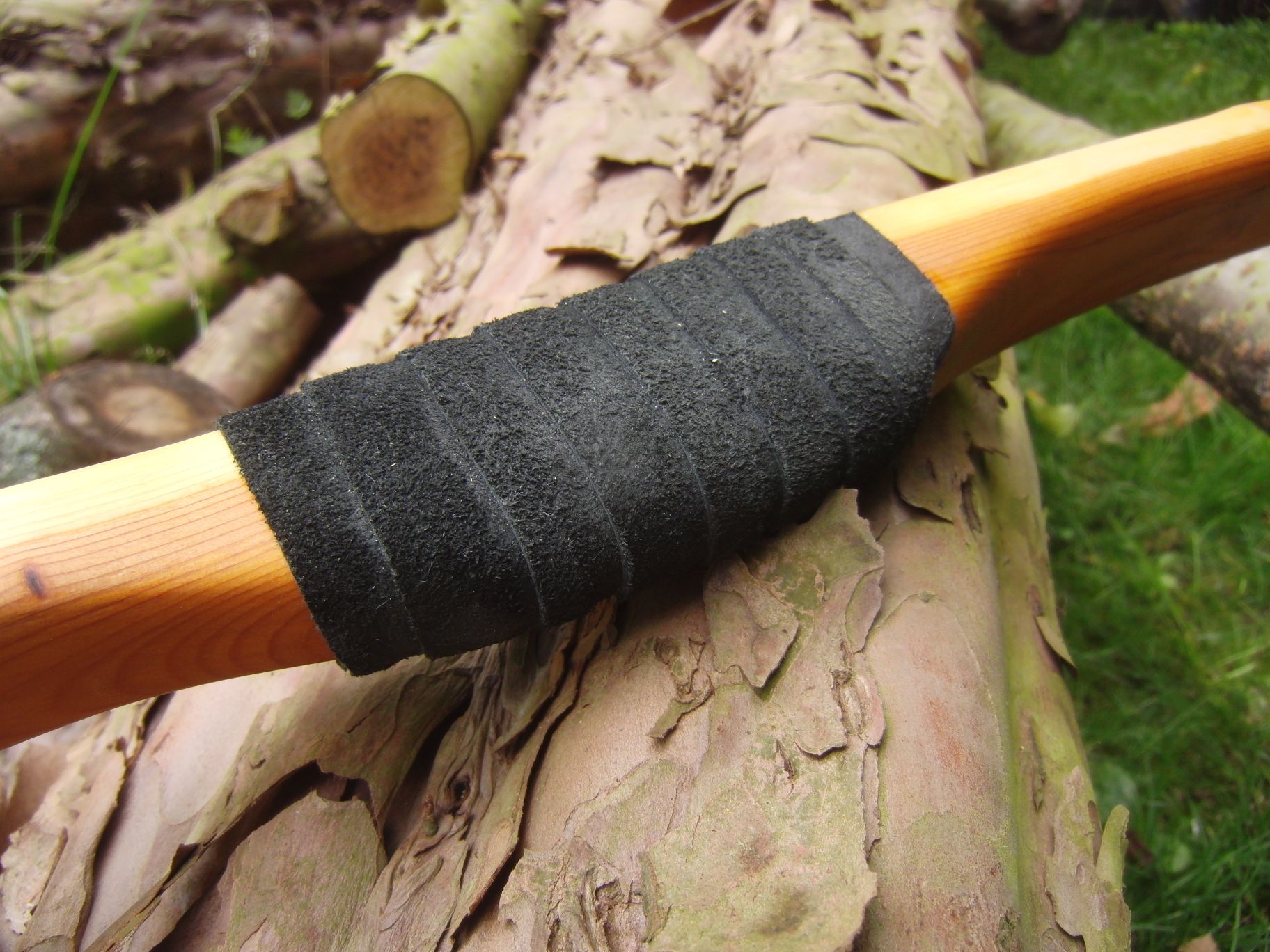 Schlussendlich bekam der Bogen, nachdem ich zuvor Überlegungen angestellt hatte, ihn ganz onhne Ledergriff zu lassen, doch einen Ledergriff. Aber keinen für mich normales Griffleder, welches auf dem Rücken zusammengeschnürt wird, sondern mal etwas für mich neueres. Ein Griffleder aus einem Lederband, leicht schräg und fest um den Griff gewickelt