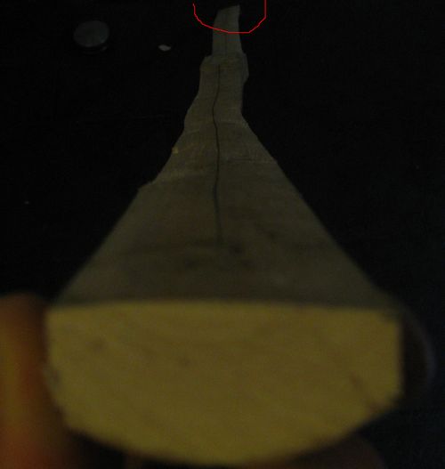 Aber aufpassen ! Mit Hobel und Ziehmesser können sich dabei, wenn man nicht vorsichtig genug ist, Späne und Fasern tief aus dem Holz herausreißen. Das läßt sich vermeiden, wenn man dort vorsichtig in Gegenrichtung arbeitet.