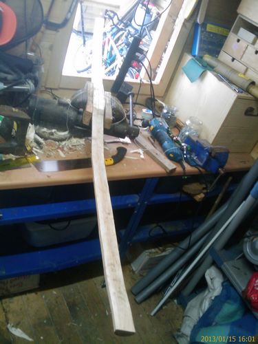 Der Stamm für den ich mich vorerst entschieden habe ist deflex gebogen, und liegt bei 12% Holzfeuchte: Leider hat er sich beim Trocknen verzogen: Den Rohling habe ich heute eine neue Mittenlinie eingezeichnet und ihn auf 1,8m gekürzt. Ich schätze, dass mein Auszug bei 76cm liegt (von Handauflage bis Sehne).