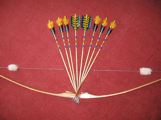 5/16" Schäfte wieder aus Fichte vom Baumarkt, 74 cm Lang, 35# Spine, 70 Grain Spitze, Indianische Befiederung 4,5" gewickelt,