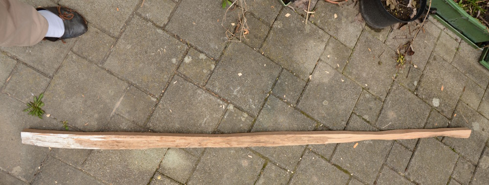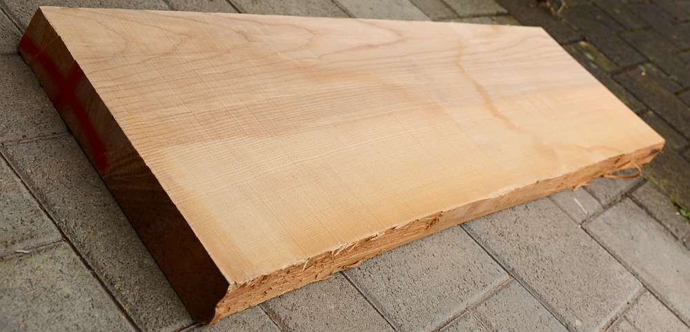 Ich ging natürlich mit dem Bogen vorbeischauen, der Platzmeister schien nicht ganz uninteressiert und half mir, ein gerades Brett (das war die Mindesteinkaufmenge) zu suchen. Das hier ist es, etwa 5 cm dick: