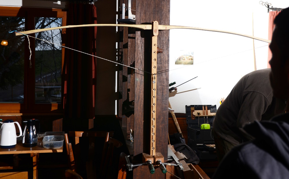 Das System setzt eine ganze Menge Werkzeug voraus. Eventuell könnte man oben an der Auflage des Bogens etwas nach hinten unterlegen damit die Sehne weiter vom senkrechten Holz wegkommt. Dann wäre auch ein größerer Haken kein Problem.