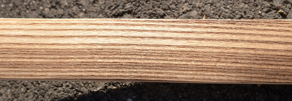 Der Querschnitt sieht, verglichen mit dem Holz für den Tillerstock, relativ unspektakulär aus. Der Spätholzanteil ist relativ gering, also nicht das, was man sich spontan wünschen würde. Die Risse sind nur hier am Ende (habe mit der Japansäge etwa 5 mm abgesägt). Ungeschliffen, deshalb noch so starke Sägespuren ;D