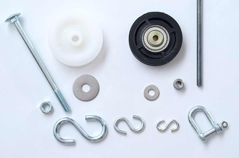 Die Seilrollen sind nun von webi, links aus Polyamid (nur Plastik) mit 8.2 mm Achsendurchmesser, rechts kugelgelagert mit 6.2 mm Durchmesser (kostet 5× so viel). Daneben die Achsen mit Unterlagsscheiben (bei der kugelgelagerten nicht nötig, aber zu spät gemerkt). Die Schrauben mit 6 mm Durchmesser waren zu kurz, deshalb als Alternative der Eisenstab mit diesen Dingern (wie hiessen die nochmals?).