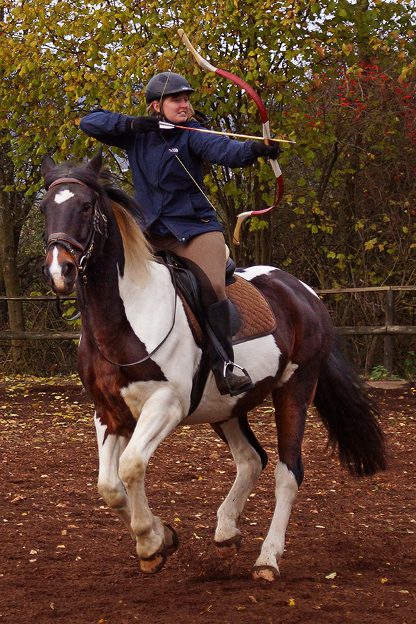 Am Sonntag hab ich dann mein Pferdchen in die Pläne eingeweiht und ein paar Pfeile neben ihm abgeschossen. Und dann von oben: Ergebnis: er trägts mit Fassung. Ich hab dann noch ein paar Pfeile im Schritt und Trab geschossen (naja, eher geploppt, damits erstmal nicht ganz so laut ist), festgestellt, das Trab nicht so die ideale Gangart dafür ist, aber immerhin mein 1,20 x1,20 m Ziel fast immer getroffen (Trick hier: schön dicht dran vorbeireiten).