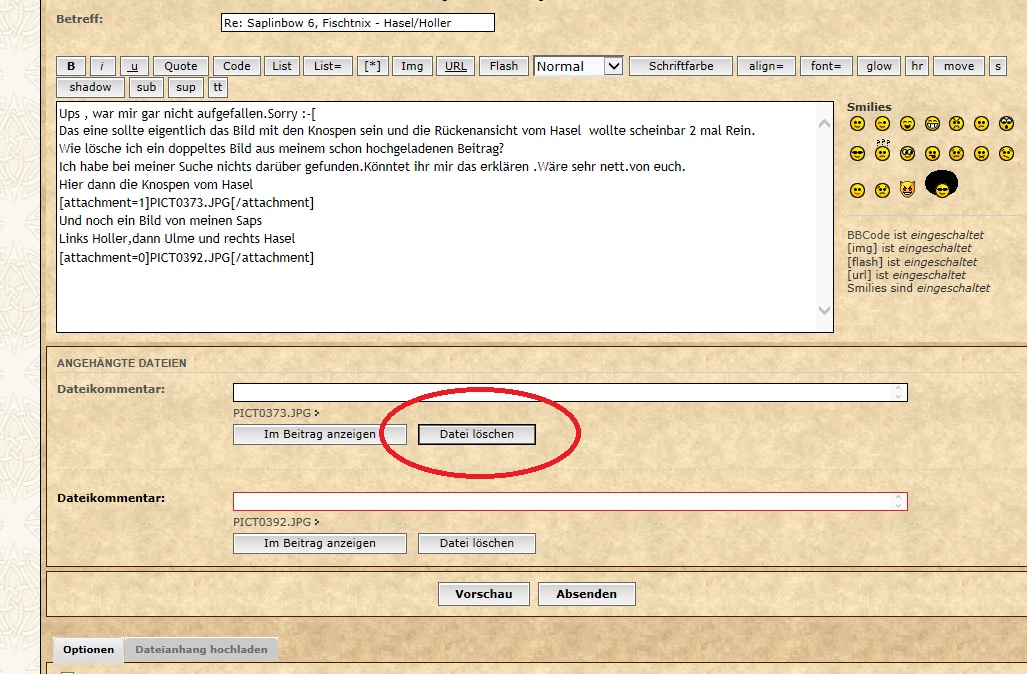 Fischtnix hat geschrieben:Wie lösche ich ein doppeltes Bild aus meinem schon hochgeladenen Beitrag?