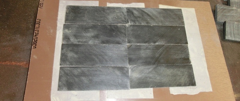 Die Hornplatten für die Inlays müssen leicht plangeschliffen werden. Dazu klebe ich sie mit doppelseitigem Klebeband auf ein Rum-Fort-Brett und gehe mit dem Bandschleifer einmal drüber, nur soviel das die groben Riefen und Sägespuren beseitigt sind.