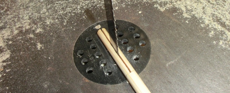 Die Pfeilschäfte werden mit der Bandsäge geschlitzt.