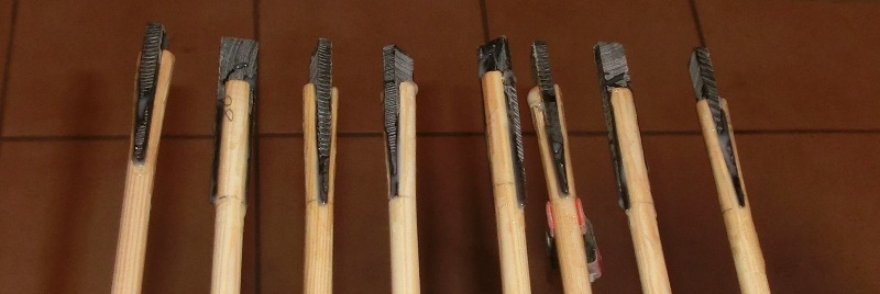 Schon etwas zu spitz um sie bequem im Schaft einzupassen. Die Spitzen werden wieder auf Sägeblattdicke „stumpfgeschliffen“, passend für den Keilausschnitt im Schaft.