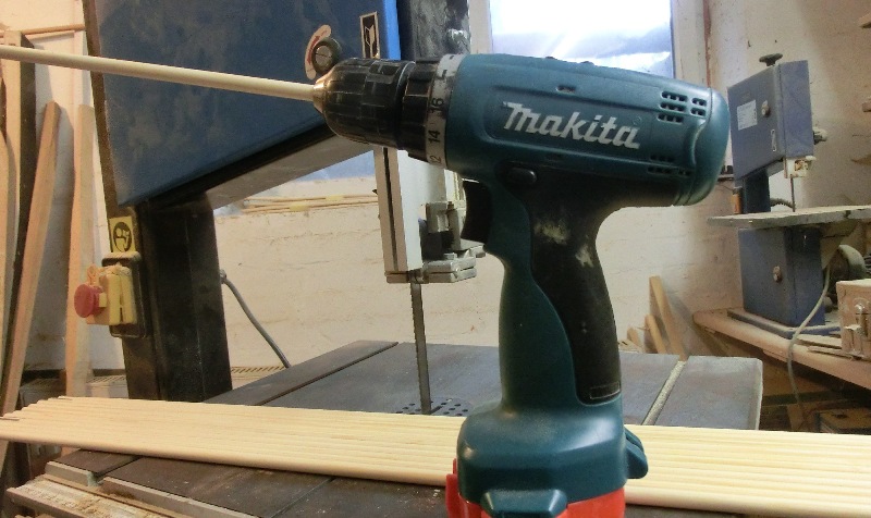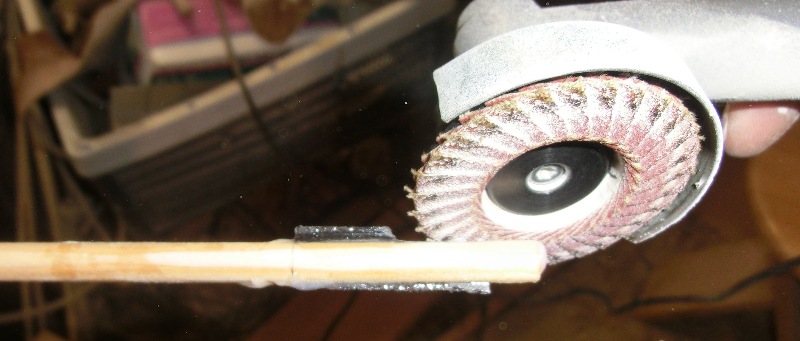 Das richtige Tapern für gebarrelte Schäfte in der Schleiflade würde lange dauern und viel Schleifpapier verbrauchen, also Schäfte in die Bohrmaschine einspannen und mit der Flex loslegen.