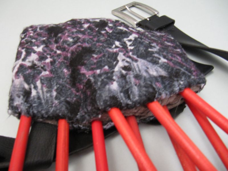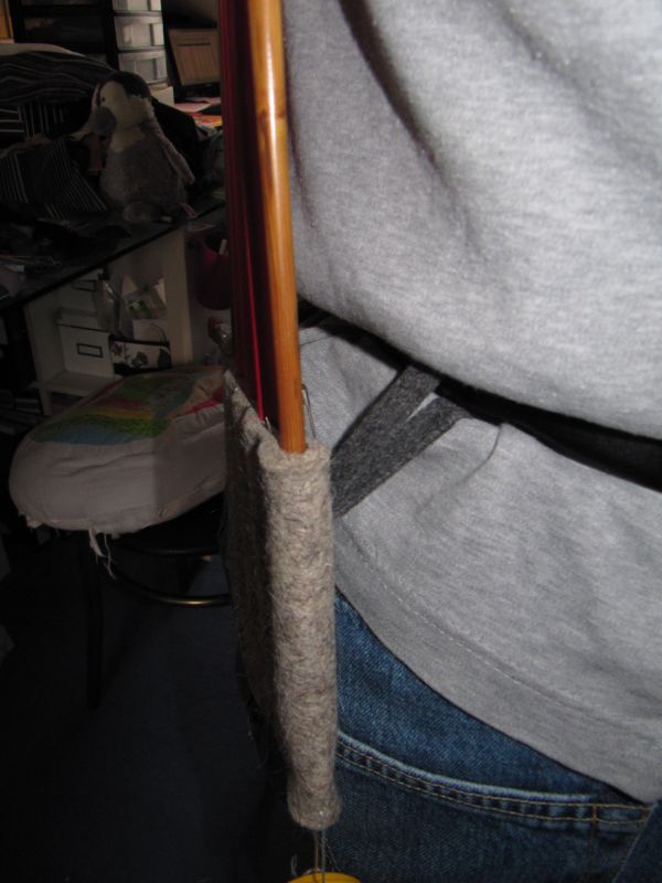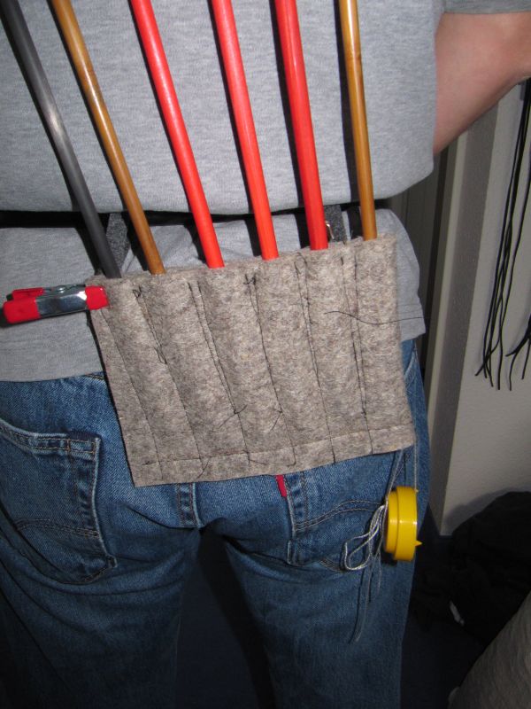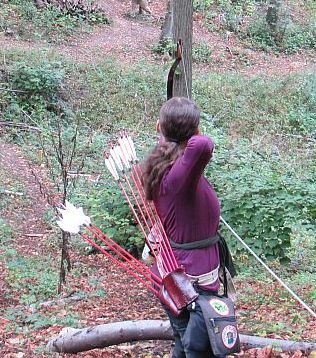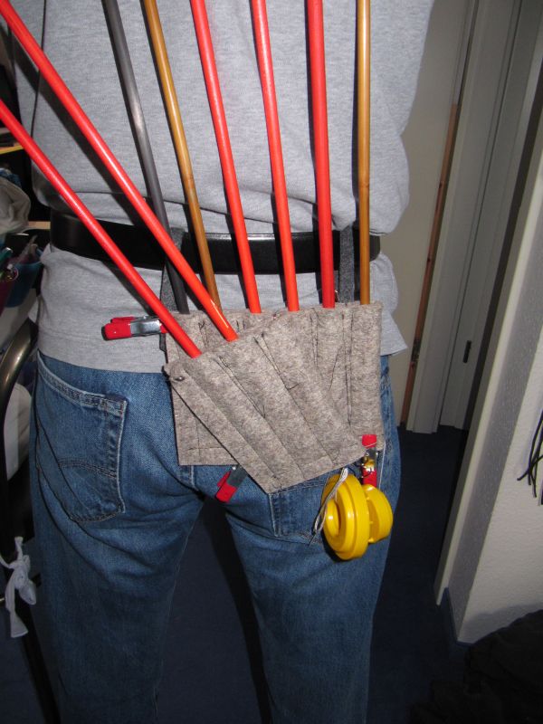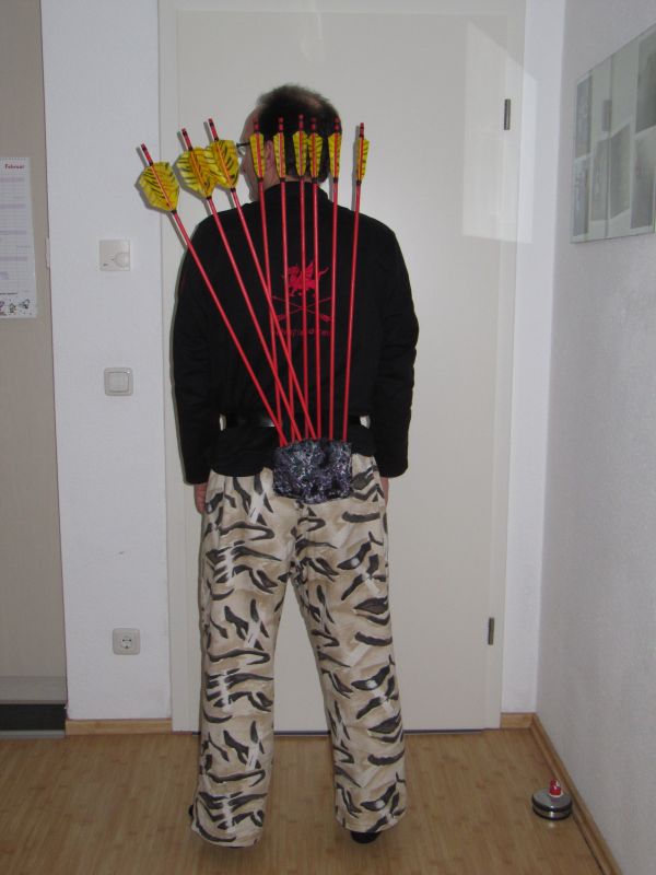 Bisheriger Tests (teilweise vor Bezug mit Stoff) waren erfolgreich. Die Pfeile sind so angeordnet, dass sie einen Rechtshänder bei Schießen nicht stören. Die 3 quer stehenden Pfeile sind linksausliegend, damit der rechte Elbogen beim Ausziehen Platz hat. Hüpfen, Springen und Sitzen sowie Schießen geht sehr gut. Die Pfeile bekommt man Einhändig gut heraus. Zum Befüllen muss man den Gürtel etwas zur Seite drehen (ca. 45°). Also für den Köcher am Besten einen separaten Gürtel verwenden.
