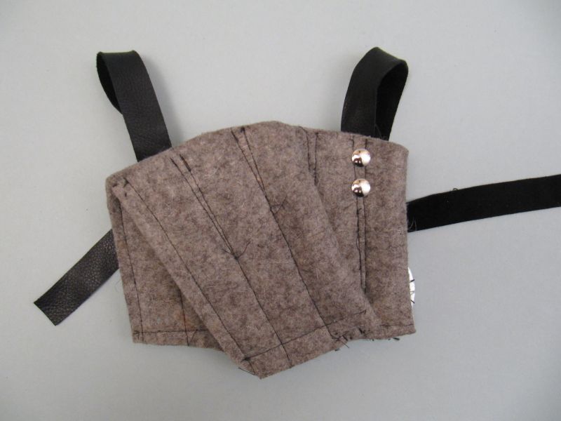 Aufhängung: 2 flexible Lederbänder, die mit Schraubnieten am Köcher befestigt sind.