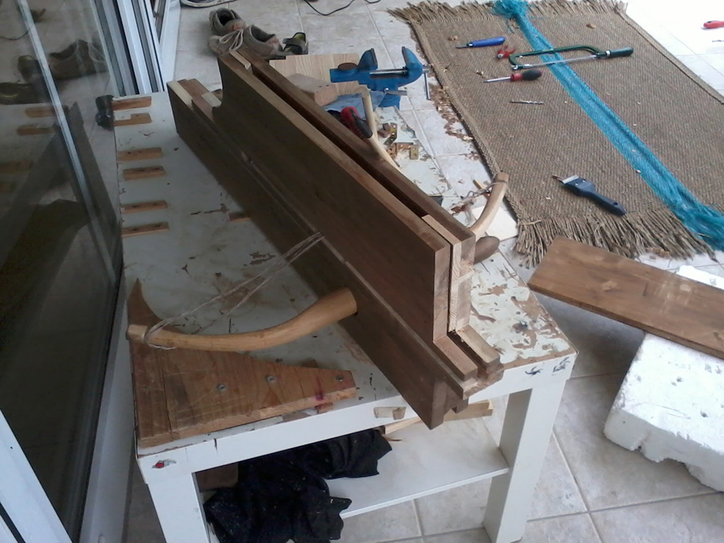Zur Zeit ist es noch ein relativ frühes Baustadium. Der Spannhebel fehlt noch, die Körperstütze ist auch noch nicht da, es ist noch keine Kante ordentlich gearbeitet und vom Finish bin ich noch weeeit entfernt.