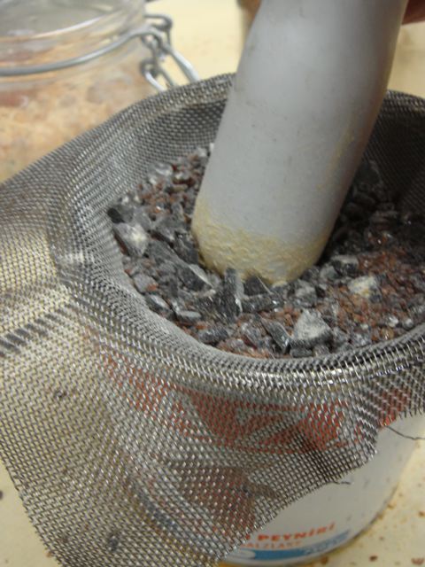 Die dünne Kolophonium-Platte lässt sich leicht zerkrümeln und die Krümel lassen sich in Sekunden zu Pulver mahlen, indem man sie durch ein Metallsieb reibt.