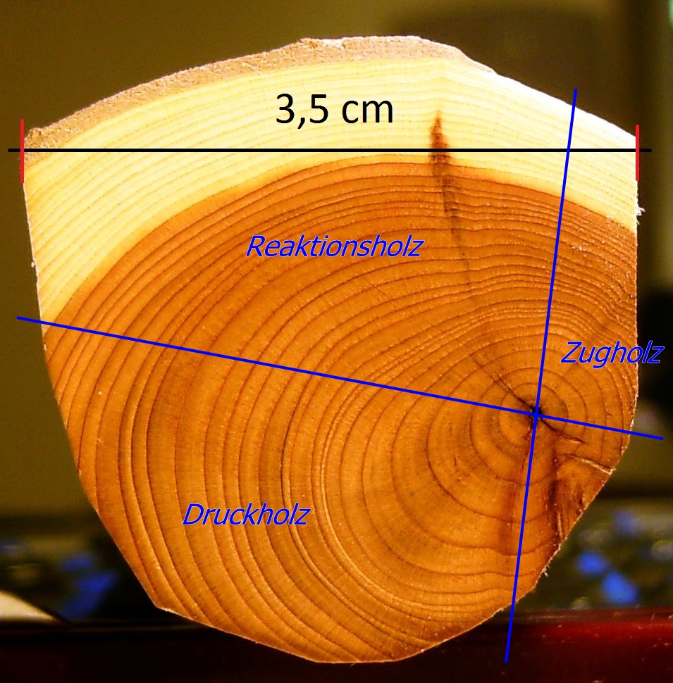 Das reaktionsholz Sitz quasi auf dem druck bzw zugholz. Ist also schon Ne dritte Kategorie. Wenn du bei Ne laubbaum mit nem Zirkel um den markkanal nein Kreis ziehst Radius markkanal bis aussenkante druckseite, dann ist das was ausserhalb vom Kreis ist das reaktionsholz.