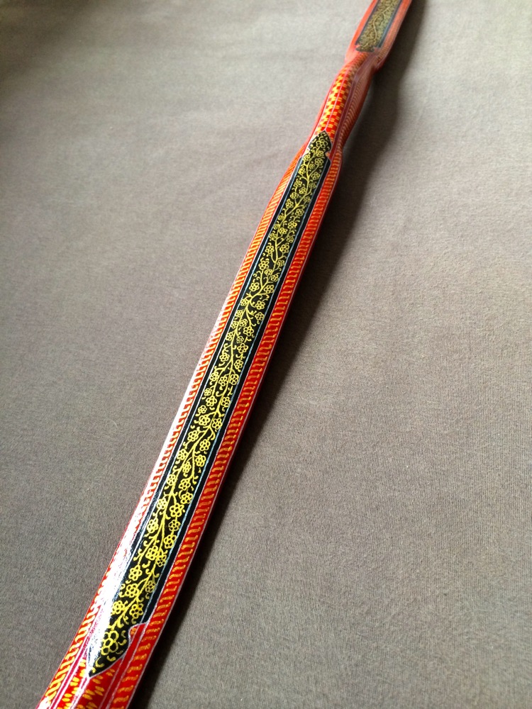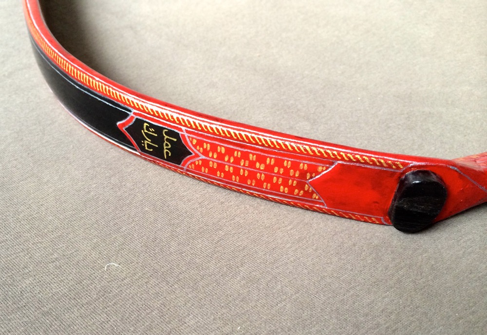 Der Bogen ist mit dünnem Leder beklebt und mit Acrylfarben bemalt. Als Vorbild für die Dekoration diente ein historischer Bogen aus der Türckischen Cammer Dresden. Über der Dekoration sind vier Schichten Klarlack.