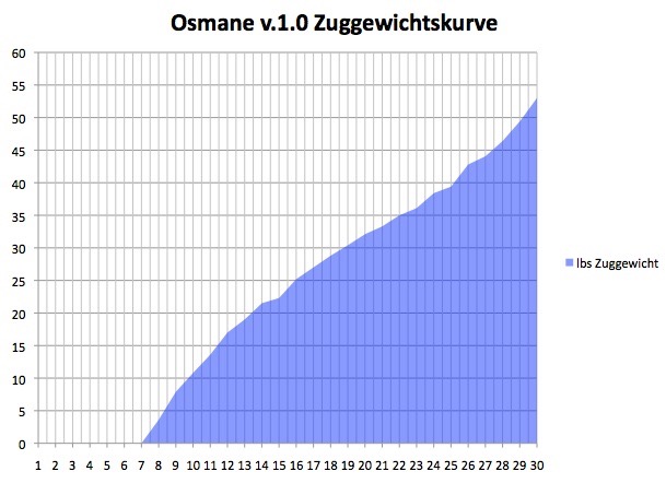 Zuggewicht: 53 (wenn es heiß ist) bis 57lbs (wenn es kälter ist) auf 30"