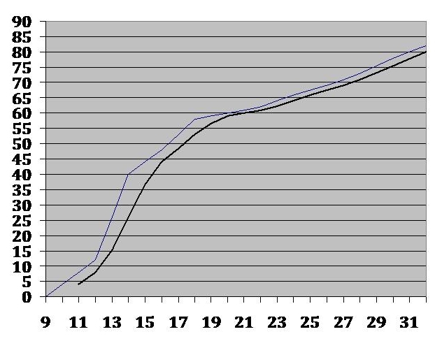 2. Arry verfügt vermutlich über einen evt. nicht ganz so guten Aufbau und hat noch nicht soviel Erfahrung beim Messen. Die Abweichungen zu einer harmonischen Kurven, führe ich primär auf "ungenaues Messen" zurück, z.B.: Statt 15,0" nur 14,7" ausgezogen oder statt 25,0" nur 24,8" aber statt 26,0" sogar 26,3" ausgezogen.