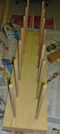 Der Ständer für 14 Didgeridoos ist jetzt fertig. Ich habe noch die Löcher gebohrt und die Stäbe reingeschlagen. Wichtig: die Löcher habe ich an den Stelen gebohrt, wo sich die Querleisten kreuzen.