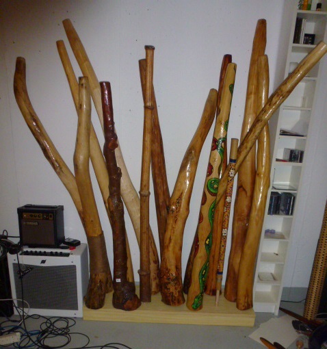 Ausser wenigen Ausnahmen sind alle meine Didgeridoos mit der Halbier- und wieder Zusammenleim-Technik gebaut. (Sandwich-Technik). Die Ausnahmen sind z.B. erste Reihe dritte von links Bärenkralle (Engelwurzel) und sechste von links Bambus. Da habe ich nur die Nodien durchgebrochen.