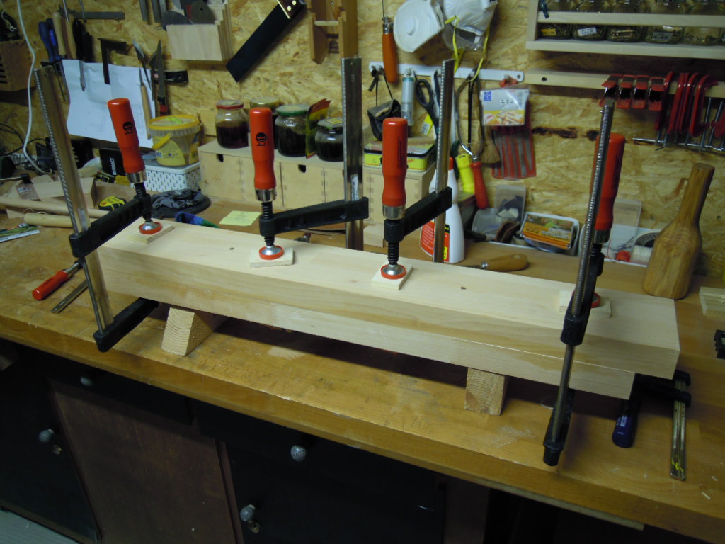 Je ein 88cm und ein 80cm Riegel werden verleimt. Leider habe ich keine Abrichte habe, musste ich mit Handhobel nacharbeiten. Durch den Faserwechsel des Leimholzes nicht ganz einfach.