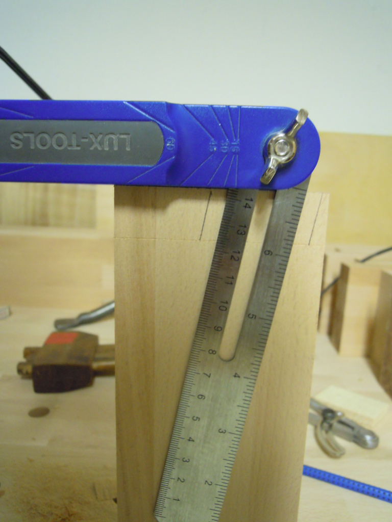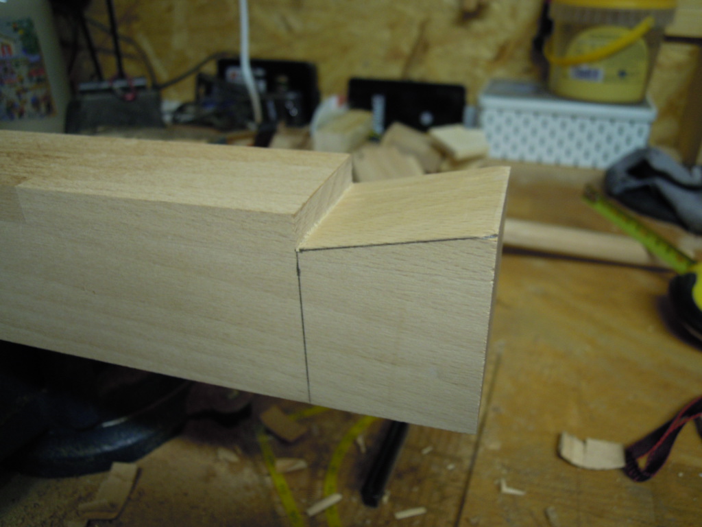 Die kurzen Riegel (56cm) und die Stangen (150cm) werden mit Schwalbenschwanzverbindungen verbunden um die Querstabilität zu erhöhen. Hier wäre es besser gewesen, die Querstange durch den gesamten Fuß zu legen und erst im letzten Riegel den Schwalbenschwanz zu legen, dies hat mir später noch Sorgen bereitet.