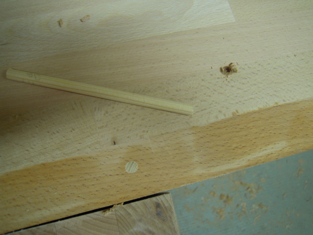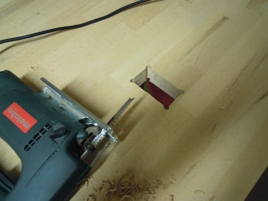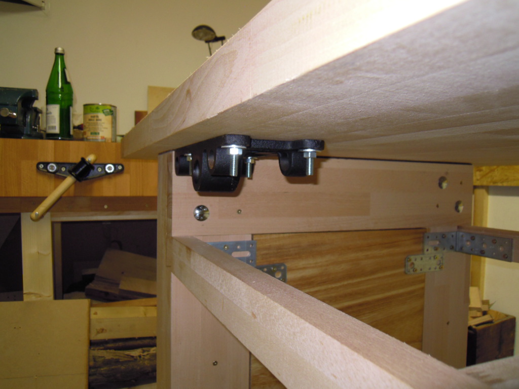 Die entsprechenden Löcher kommen in die untere der zwei Arbeitsplatten. Die obere Platte deckt diese optisch nicht ganz ansprechende Verbindung ab.